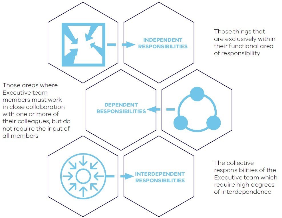 High-performing Executive teams are clear on what they are collectively responsible for that requires a high degree of interdependence amongst its members. Importantly, these responsibilities are limited and do not represent all things – in fact high-performing teams distinguish between the issues that need everybody’s involvement and those that need only some members involvement; where an individual expert is trusted to ‘get on with it’ and be personally accountable.